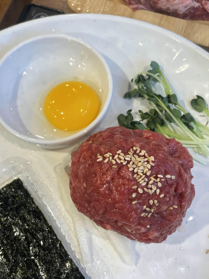 육회도 넘 저렴하길래 바로 주문해봤습니다. 꾸밈없이 나오는 딱 깔끔한 육회, 노른자가 별도로 나오고 육회 밑에 배가 깔려있어요. 그냥 먹어도 맛있지만 역시나 계란 노른자를 섞으니 훨씬 고소하고 맛있더라구요. 대박나소 육회도 넘 괜찮더라구요. 신선하고 약간은 매콤한 양념이 들어가서 훨씬 맛있었어요. 화정 대박나소는 요런 사이드메뉴외에도 밑반찬들도 괜찮았는데 셀프로 맘껏 가져다먹을 수 있었답니다.