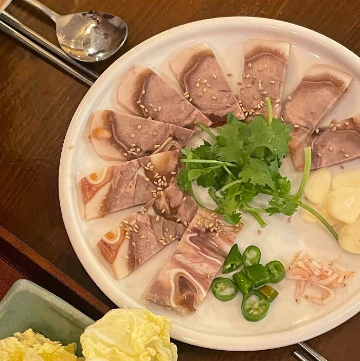 애호락 잔치상 코스는 총 7가지의 요리가 코스로 나오는데 모든 메뉴가 부족함 없이 메인 처럼 나오는게 특징이에요. 가장 처음 나온 돼가리 편육은 국내선 돈두육을 잡내없이 삶아내어 살코기 비중을 높여 발골한 것인데요. 얇고 야들한 식감이 특징이였고 새우젓, 고추, 마늘과 함께 곁들여 먹으니 잡내하나없이 깔끔하게 먹을 수 있는것이 좋았습니다.