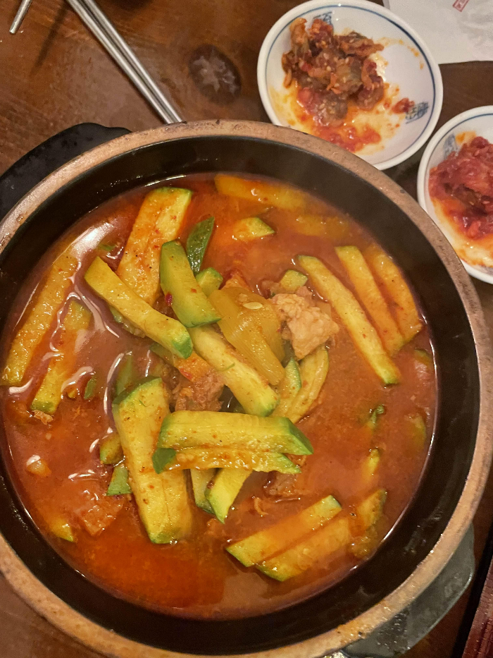 애호가의 대표메뉴중 하나인 애호박 돼지전골 , 칼칼한 육수와 돼지고기가 듬뿍 들어간게 특징인데 국물이 워낙 진하고 매콤해서 요건 점심메뉴로도 많이들 드시러 오시더라구요. 완전 푹 끓여져서 애호박이 완전 부드럽게 씹히고 고기도 듬뿍 들어가 있어서 밥 한 공기 뚝딱 할만큼 넘 맛있었습니다. 중독성 있는 맛이라 애호락에서 넘넘 추천하는 메뉴입니다.