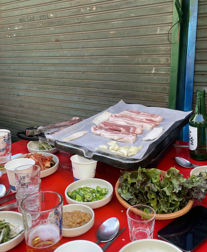 을지로 야장 삼겹살맛집 삼미정은 이 빨간 테이블과 의자가 특징인데요, 이런 을지로바이브를 좋아하는 저에게는 너무나도 만족스러운 장소선정. 특히나 삼겹살 가격도 1인분에 15,000원으로 가격대도 적당하고 좋더라구요. 자리 앉자마자 엄청 빠르게 반찬이랑 식기들이 세팅됩니다. 저희는 4명이서 4인분 바로 주문했어요.