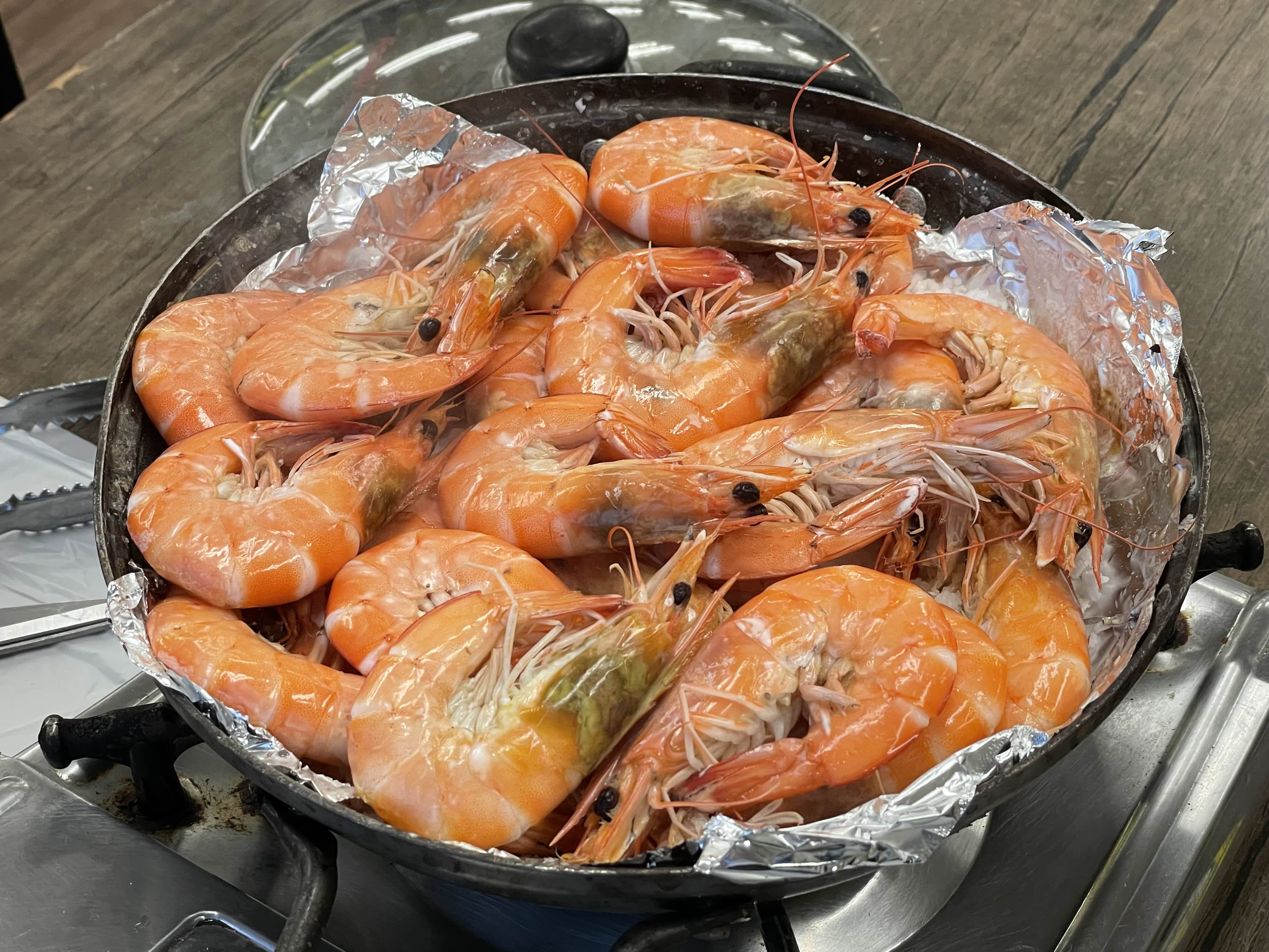 살아서 팔딱대는 대하, 소금 위에 잔뜩얹어서 구워줍니다. 큰 냄비에 꽉 찰 정도로 양을 많이 주셨어요. 둘이 1kg먹으면 충분하고 셋 이상은 2kg정도 고르면 될 듯 합니다.