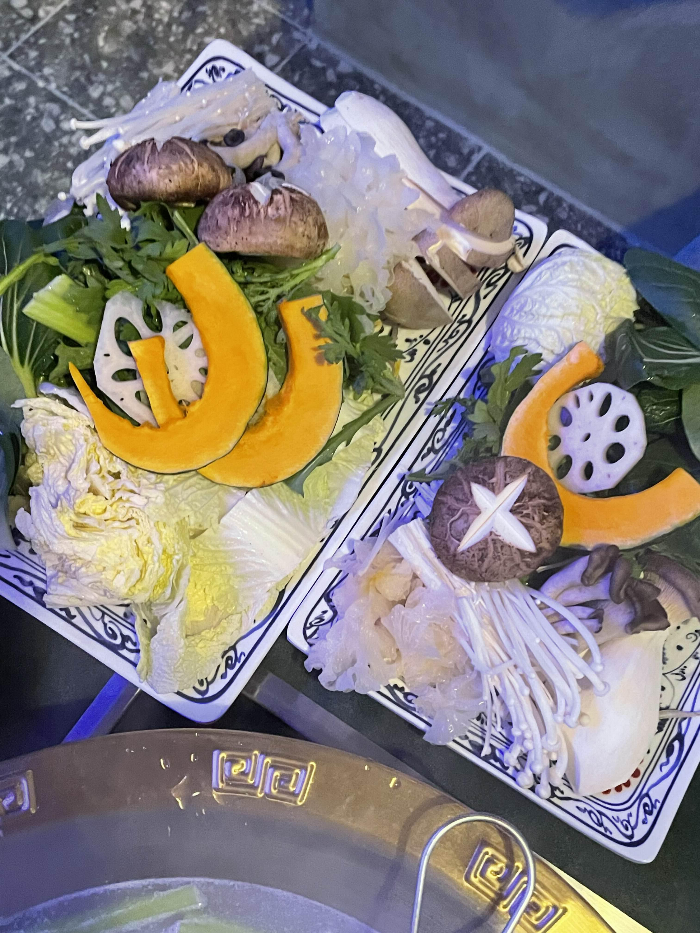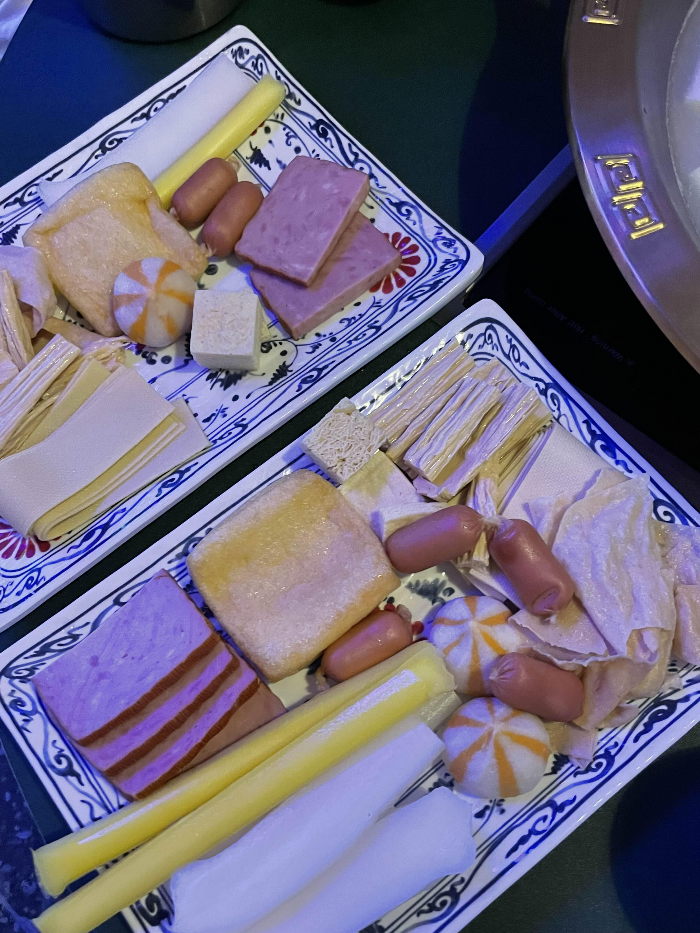 우선 저희는 훠궈를 먹으러 왔기때문에 양고기훠궈3인을 주문했습니다. 가격대도 괜찮고 각종 사리들의 구성도 넘 퀄좋고 다양하더라구요. 먼저 나온 모듬 면사리와 모듬 야채사리 , 3인 기준 굉장히 푸짐하죠? 야채는 청경채, 목이버섯, 배추 등 신선한 채소들로 준비되고 면 사리라고 하기엔 살짝 아리까지 하지만 분모자와 뉴진면 햄, 소시지, 푸주 등이 제공됩니다. 뭔가 훠궈 사리 구성이 대부분의 사람들이 딱 좋아할만한 것들로만 이루어져 있어서 센스있다 싶었어요.