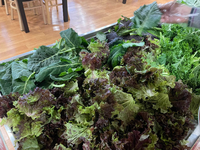 영종도맛집 해송쌈밥의 가장 큰 장점은 완전 싱싱한 야채를 직접 담아 먹을 수 있다는 점인데요 . 저는 상추말곤 잘 안먹지만 야채 좋아하시는 분들에겐 다양한 쌈채소를 맛볼수 있다는게 엄청난 이점이죠? 갓 따온 것처럼 시들시들한 야채없이 싱싱한 것만 가져다 두셔서 갠적으로 넘 퀄 좋다고 생각했습니다.