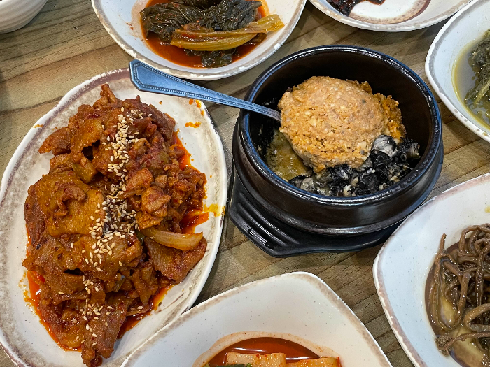 1인 18,000원의 우렁쌈밥정식, 인원수대로 주문하면 된답니다. 만원 후반대라 저렴하다고 하기도 애매하긴 하지만 반찬 가짓수도 많고 무한리필인데다 싱싱한 야채까지 먹을 수 있으니 저는 괜찮은 가격인듯 합니다. 영종도 당일치기 여행 시 와보면 넘 좋을만한 호불호 없는 우렁쌈밥맛집 해송쌈밥, 반찬이 요렇게 많습니다. 메인반찬은 제육볶음 , 그리고 깻잎, 젓갈, 우렁된장 쌈 등이 세팅됩니다. 밑반찬은 전부 무한리필이라 먹고 싶은만큼 먹을 수 있어 좋았습니다. 전체적으로 모든 반찬들이 자극적이지 않고 슴슴하니 간이 잘 맞아서 다 맛있게 먹었답니다.