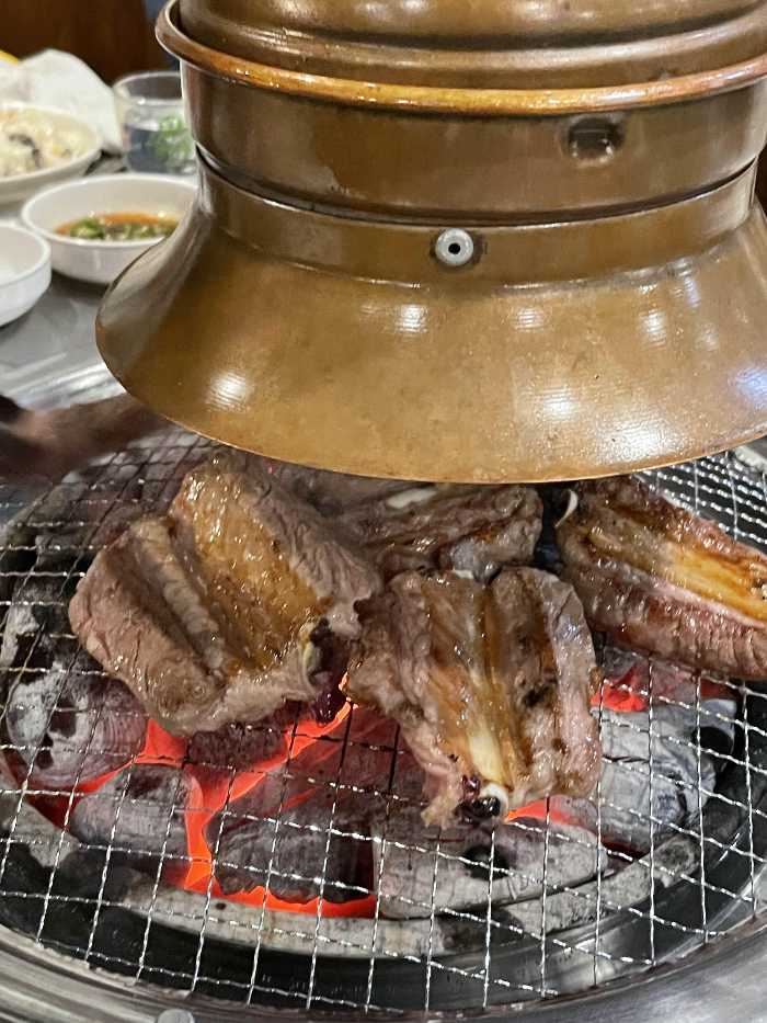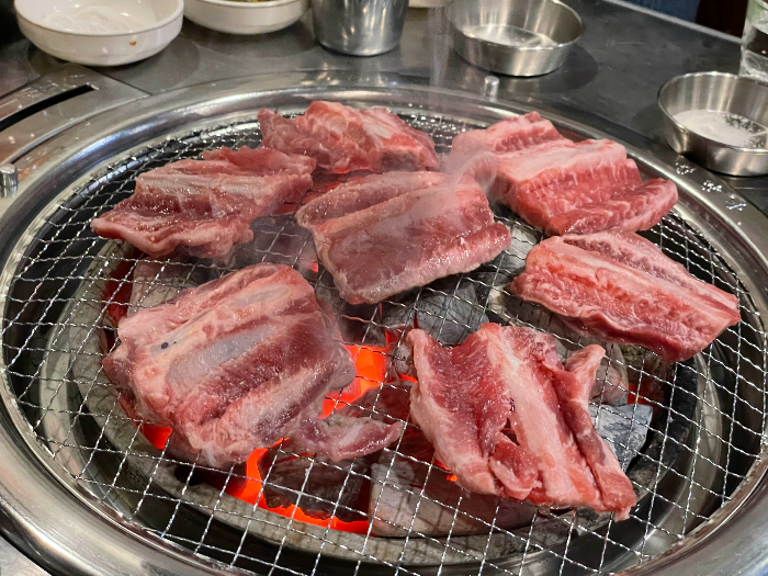 첫 판은 직원분께서 요렇게 예쁘게 올려주시고 직접 구워주시는데 굽는 법은 생갈비 뼈가 보이는 쪽을 위로 향하여 구워줍니다. 육즙을 보호하기 위해 굵은 소금을 적당량 뿌려주고 적당히 익었다 생각들 때쯤 뒤집어주면 됩니다. 살코기가 많은 분위이기 때문에 오래 구우면 질겨질 수 있으니 핏기가 적당히 가시면 먹으면 된다고 합니다. 갠적으로 소금은 꼬옥 뿌려서 익혀드시는게 좋을 듯 해요. 훨씬 감칠맛 나고 맛있답니다.