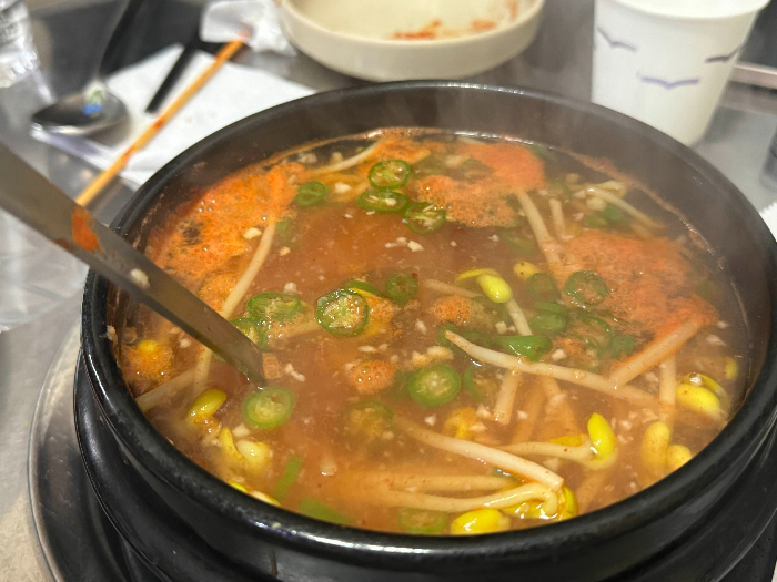 2인분 이상 주문 시 같이 제공되는 콩나물국, 서비스라곤 믿기지 않을 만한 양과 퀄리티입니다. 칼칼한 콩나물국에 청양고추도 듬뿍 들어가서 얼큰하면서도 시원한 맛이에요. 기본적으로 양도 많이 주시지만 추가도 2천원으로 넘 저렴해서 소주안주로 이만한게 없더라구요.