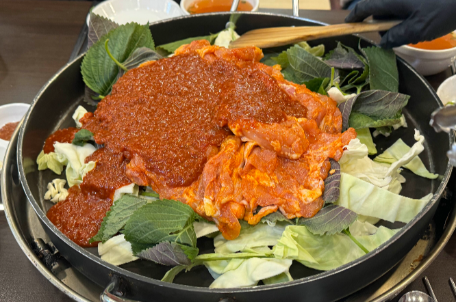 오근내닭갈비 3인분 등장, 큼지막한 닭다리살과 깻잎, 양배추, 고구마 등 야채도 푸짐하게 세팅됩니다. 양념도 듬뿍 올라가있는데 보기만해도 넘 먹음직스럽더라구요. 통으로 큰 판에 나오는데 직원분께서 먹기 좋은 크기로 다 잘라주셔서 완전 편하게 먹을 수 있습니다. 이때부터 느꼈지만 냄새가 워낙 강해서 저녁에 약속있는 날은 왠만하면 오지 않는 것을 추천합니다. 가게 밖에 페브리즈도 놔주셨지만 이걸로 택도 없는 정도거든요.