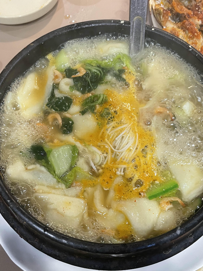 드디어 메인메뉴인 털레기수제비2인, 2인분인데 셋이 먹어도 충분할 정도의 양입니다. 셋이서 2인분 주문하고 다른 메뉴 하나 시키면 딱 양이 맞을듯 하더라구요. 저는 털레기가 뭔지 몰랐는데 이것저것 탈탈 털어서 만든 걸 털레기라고 한다고 합니다. 이제야 알았지만 털레기 수제비 넘넘 맛있었어요. 국물도 간이 적절하고 시원한 맛에 수제비도 쫄깃하니 식감이 넘 좋았어요.