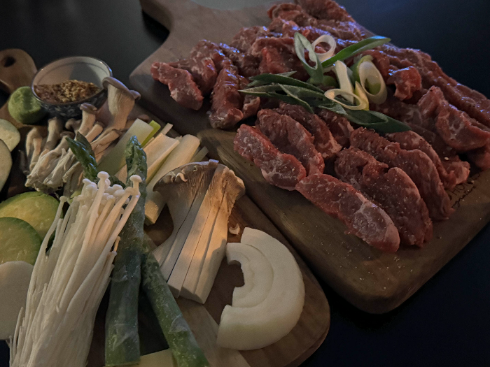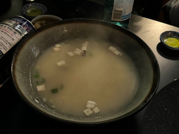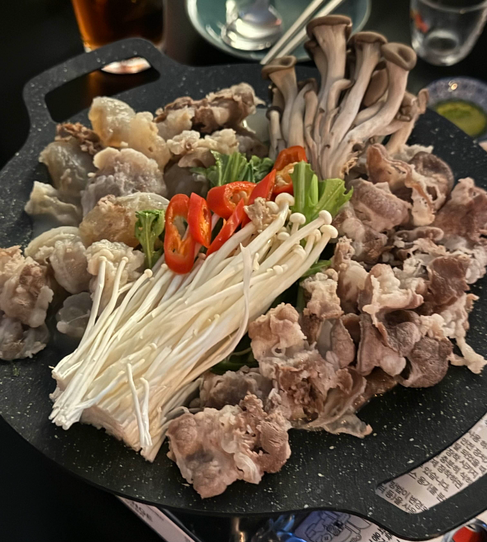 가장 먼저 나온 우삼겹스지수육 + 사골국, 그냥 스지수육 비쥬얼 일줄 알았는데 퀄 너무 좋고 양도 너무 많더라구요? 그리고 특이한게 화정보고십엇소 스지수육에는 사골국이 같이 나오는데요. 사골국을 스지전골에 살짝 부어서 촉촉하게 끓여먹어도 되고 그냥 국물 안주로 떠먹어도 되는데 살짝 짭조름하고 간이 쎄서 자극적인걸 좋아하는 제 입맛에 딱이였답니다. 짠거 못드시는 분들에겐 살짝 호불호가 갈릴 수 있을 듯 했습니다.