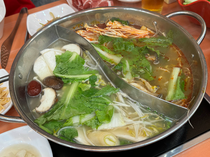 딱 기본으로 홍탕, 백탕 제공되는데 홍탕 너무 맵지 않아서 좋았어요. 훠궈소스 더 달라고 하면 주시니 매운거 좋아하시는 분들은 참고해주심 좋을 것 같아요. 백탕, 홍탕 다 진한 국물이 넘 맛있어요. 각각 야채와 버섯을 넣어주고 고기도 투하해서 맛나게 먹었답니다. 세트메뉴라 양이 은근 부실할까 헀는데 생각보다 양도 많은 편이고 사진에는 없지만 샤브샤브 정식세트에 꿔바로우까지 포함되어 있어서 훠궈 + 꿔바로우 구성으로 먹을수 있답니다.