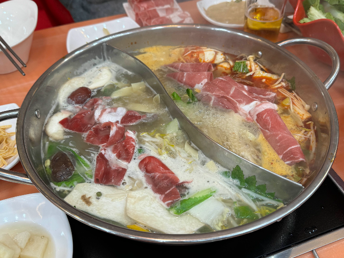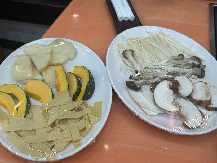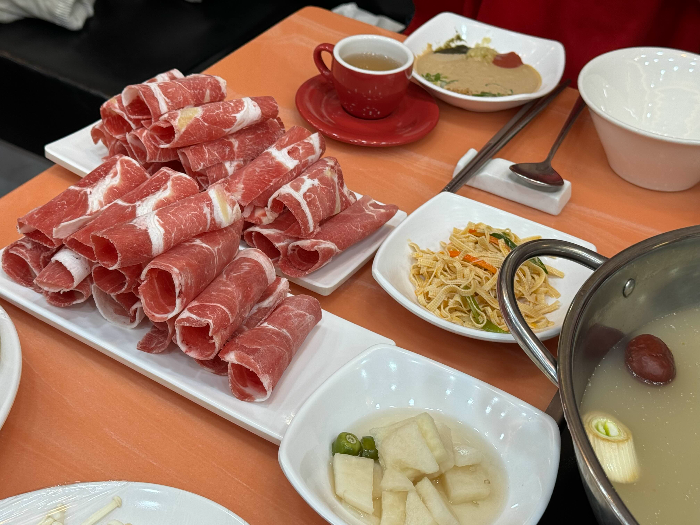 들어가자마자 테이블마다 기본 세팅은 다 되어있더라구요. 훠궈에 넣어 먹을 야채, 버섯, 단호박, 감자, 숙주 그리고 소스까지 싹 다 미리 준비가 되어있습니다. 고기도 소고기, 양고기 선택할 수 있는데 이 날은 양고기를 선택했습니다. 다만 재료들이 전부 랩이 씌워 나와서 신선한 느낌은 덜했고 특히나 소스가 많이 굳어있어서 그 점은 조금 아쉬웠습니다.