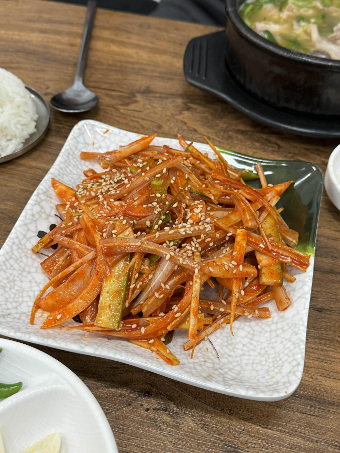 메뉴판에 처음보는 음식인 귀무침이 있어서 한번 시켜봤는데 이것도 엄청 괜찮더라구요? 새콤매콤한 소스에 쫄깃한 식감의 귀무침이 생각보다 거부감없이 넘 맛있었어요. 근데 이건 정말 딱 소주 안주라 저녁에 가서 국밥에 귀무침 시켜서 소주 한잔하기 좋겠더라구요. 한번도 안먹어본 음식이라 경험해봐서 넘 좋았어요. 귀무침 좋아하시는 분들은 홍이순대국 가보심 좋을 듯 합니다.