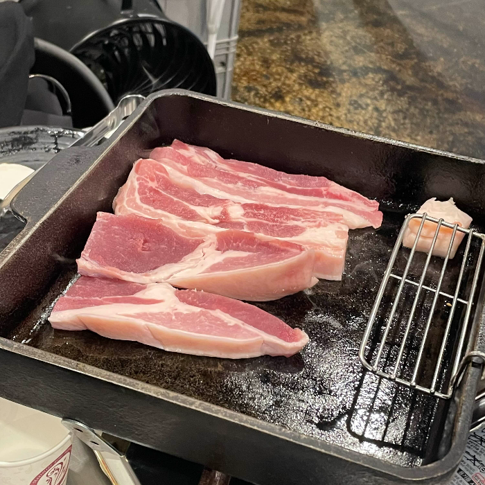 오겹살 2인분이 바로 불판위로 올라갑니다. 직원분께서 처음에 직접 고기를 올려주시고 그 이후엔 잘(?) 익혀먹으면 되는데요
