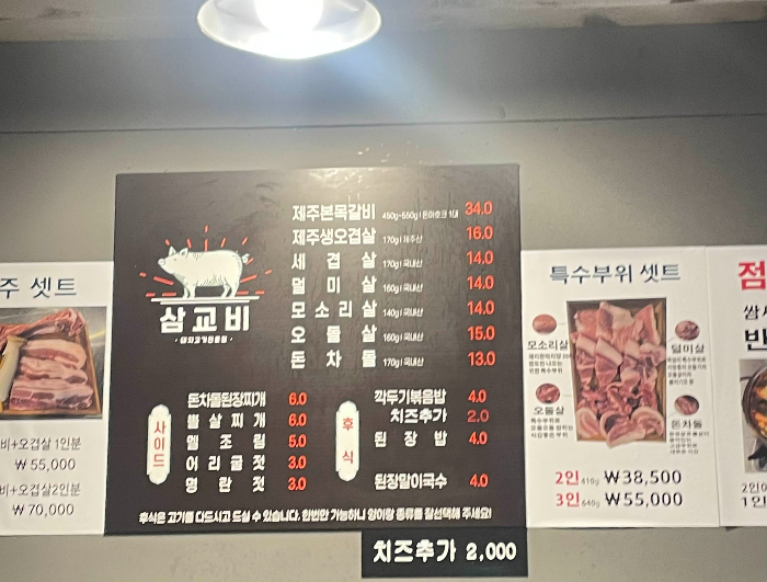 을지로맛집 을지삼교비 메뉴판 입니다. 제주본목갈비 , 제주생오겹살 그외에도 돼지 특수부위도 판매하고 있었어요. 사이드 메뉴도 맛있어보이는게 굉장히 많았답니다. 저는 2차를 갈거라서 오겹살만 2인분 간단하게 주문해보았어요