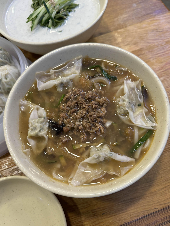 명동교자의 메인 메뉴 칼국수 먼저 등장했습니다. 완전 진한 닭 육수에 잘게 썰은 고소한 고명 그리고 부드러운 면발과 존재감 너무 대박인 만두까지, 맛 없을수가 없는 구성입니다. 다른 칼국수 맛집도 많이 가봤지만 딱 기본적으로 제일 맛있는 칼국수인 듯 해요. 특히나 국물이 너무 맛있고 얇은 만두피 식감도 넘 좋습니다. 양이 그리 많은 편은 아니라서 부족하면 국수 사리 추가로 주문하시면 좋을 듯 합니다.