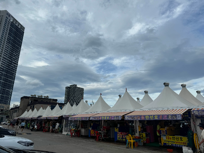 제가 방문한 날은 비도 오고 날도 좀 흐렸어요. 안 그래도 더운데 습기까지 가득하니 정말 죽을맛, 동명항 오징어난전 도착하면 요렇게 포차거리처럼 쭈욱 되어있는데 가격대나 메뉴 종류는 다 비슷하기 때문에 가장 시원하거나 여유있는 곳 방문하심 될 듯 합니다. 속초 동명항 오징어난전은 그 날 그날 조업량에 따라 가격리 조금씩 달라질 수 있는데 대체로 한마리 당 만원 생각하시면 편합니다. 그리고 운이 안 따라주면 배가 안들어온 날은 오징어난전을 경험할 수 없다는 점!