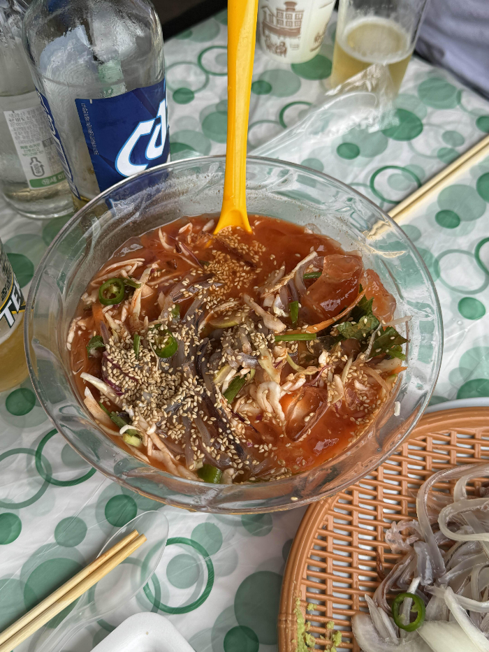 의외로 더 괜찮았던 물회, 너무 더웠어서 물회가 나오니 너무 좋더라구요. 비록 양은 적지만 물회 맛도 괜찮고 골라먹을 것도 많아서 후회 없었던 메뉴 , 특히나 오징어회+물회 조합이 아주 괜찮았습니다.