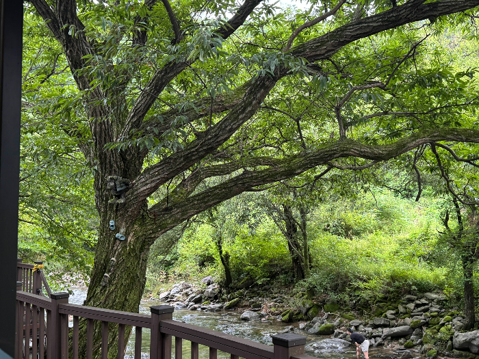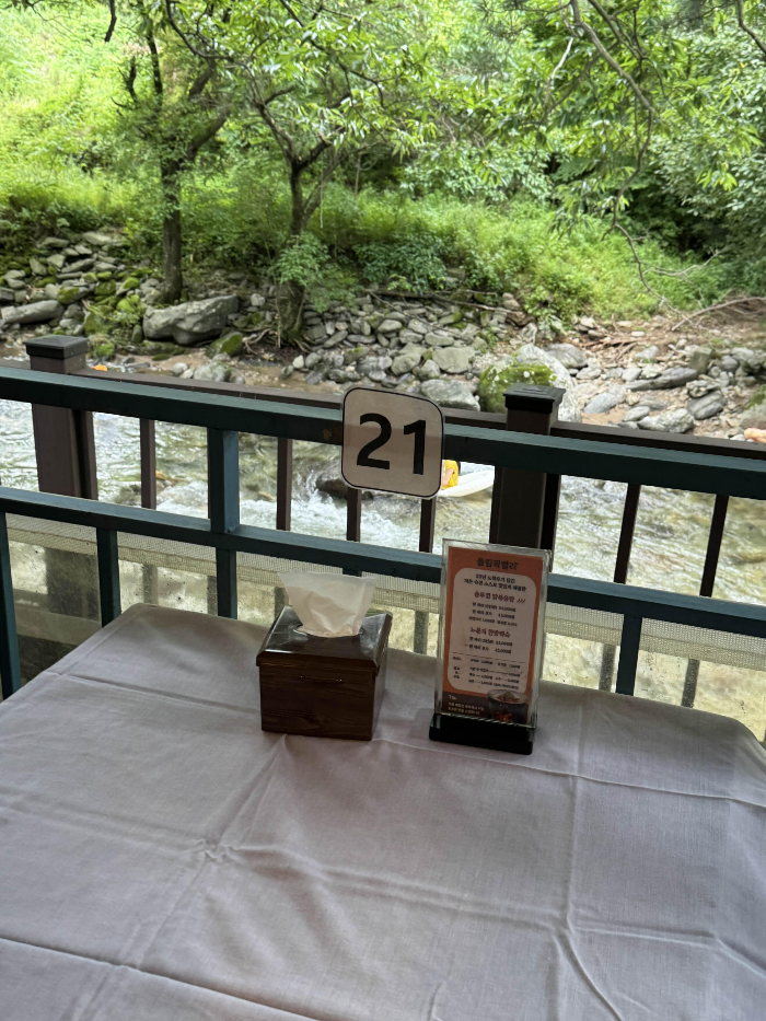 저희는 이쪽에 자리를 잡았답니다. 완전 계곡뷰라 힐링 대박이에요. 아무래도 실내라 해도 뚫려있어서 살짝 더웠는데 계곡 바로 옆이라 그나마 바람도 좀 불고 해서 살 것 같더라구요. 밥 먹기 전 계곡에서 맘껏 놀다와도 되기 때문에 어린이들 동반한 부모님들께 너무너무 추천하는 곳 , 요즘 같이 더운 날에 휴가 가는 느낌 제대로 느낄 수 있을 듯 합니다