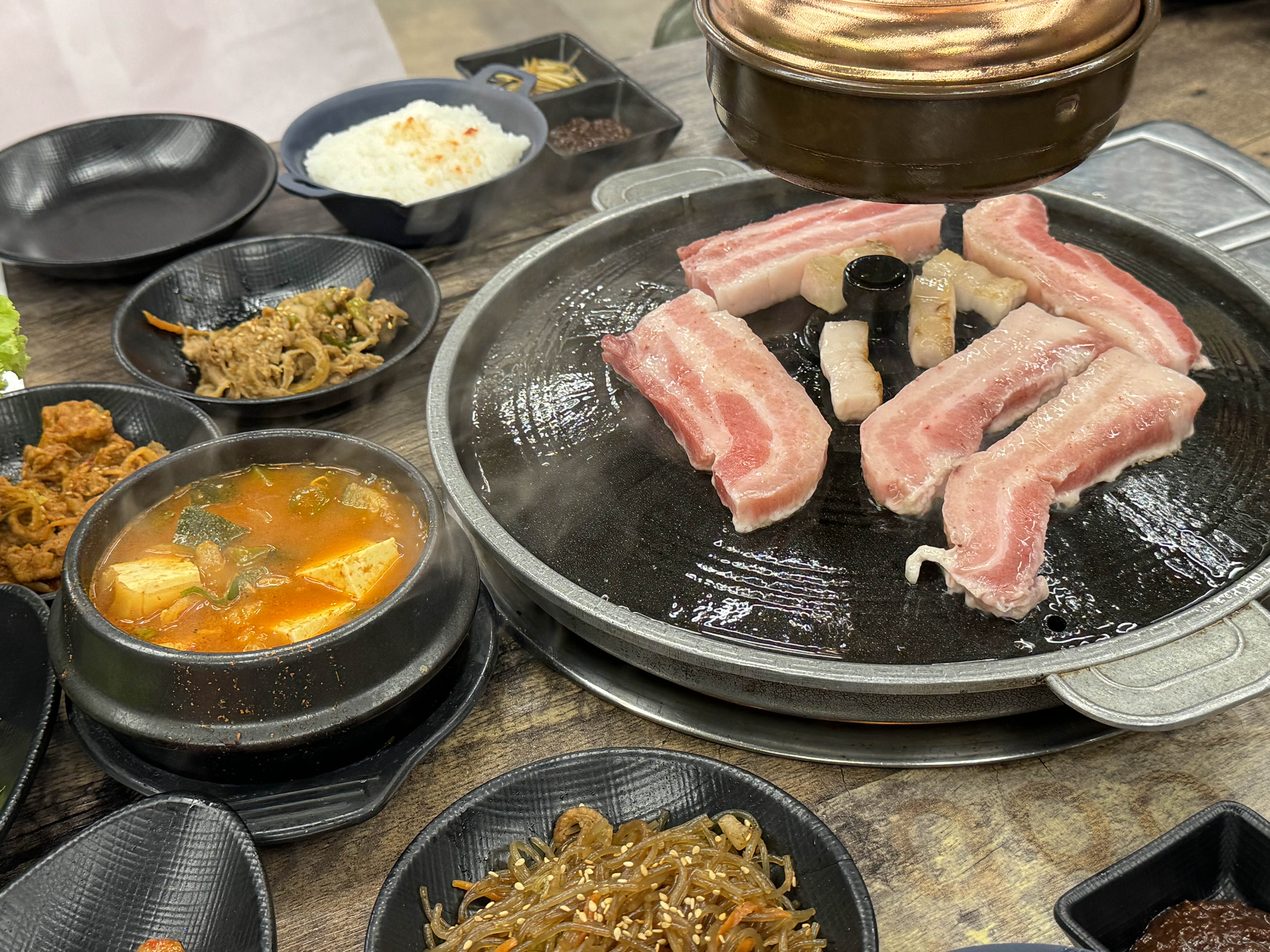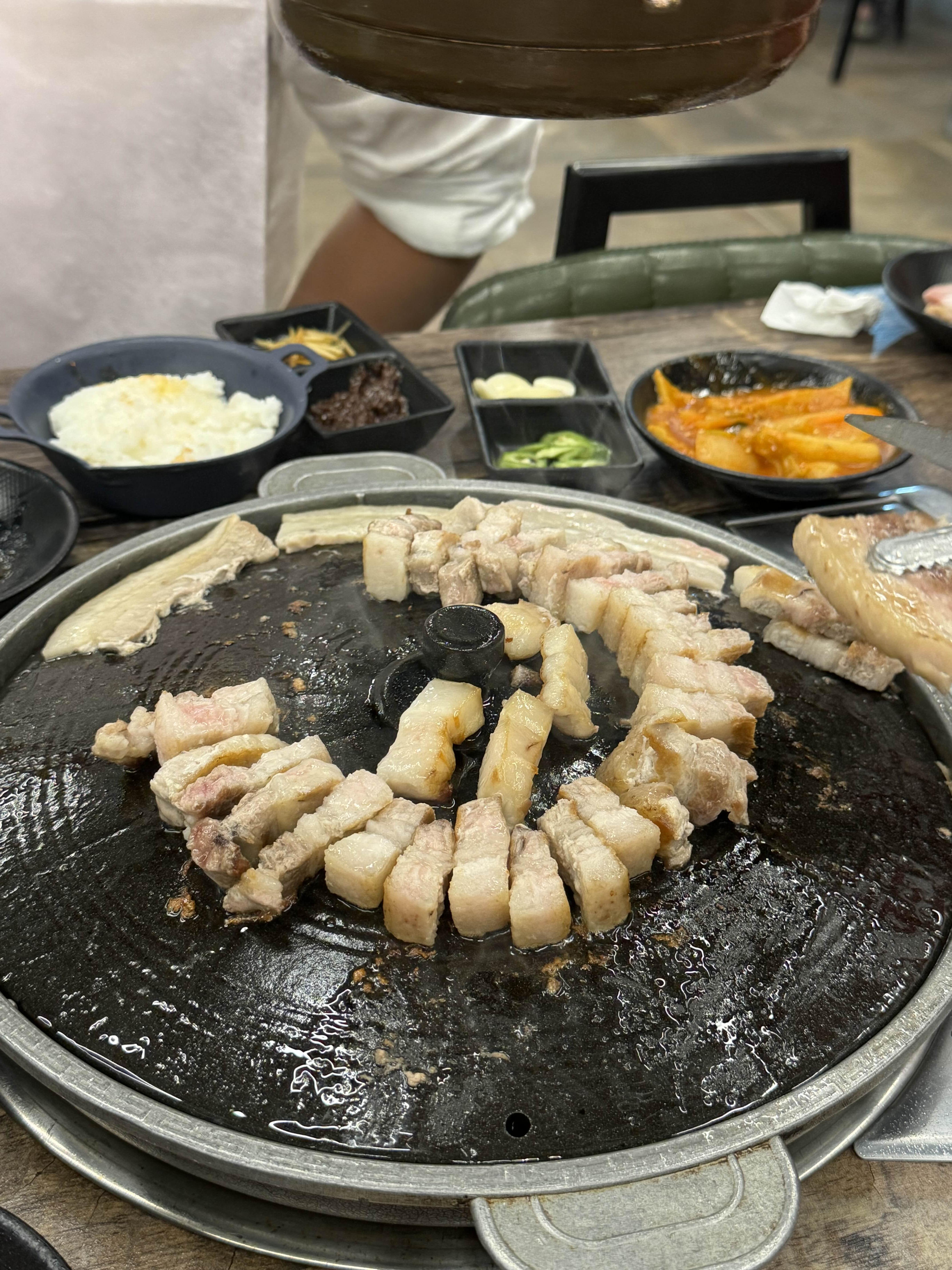 불판위에 익어가는 맛난 삼겹살과 푸짐한 반찬들 , 필리핀 여행가신 애주가분들은 꼬옥 들러야할곳이 아닌가 싶습니다. 현지 직원분께서 고기도 신경써서 직접 구워주시는데 나중에 따로 팁 챙겨드릴만큼 고기 맛나게 잘 구우셔요.
