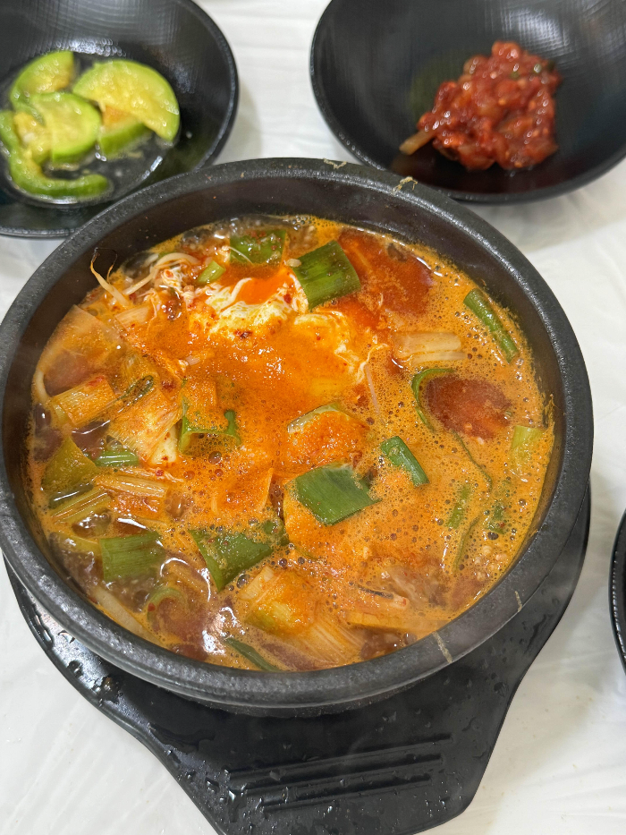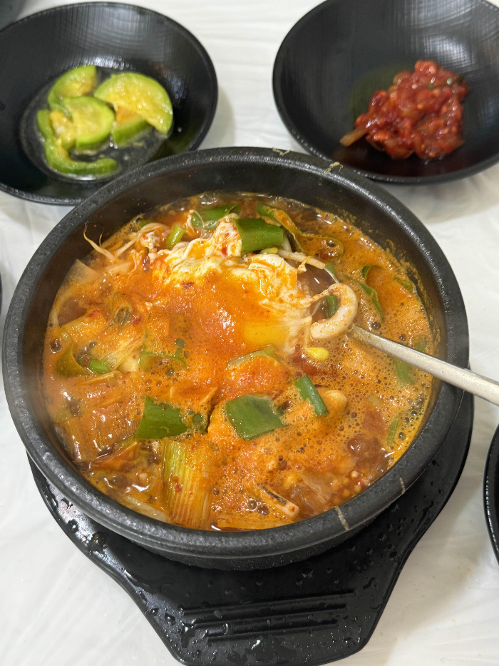 별 거 없는 듯 하지만 콩나물 , 파 듬뿍 들어가있고 계란까지 풀어져있어서 약간 순두부찌개 느낌도 나더라구요? 갠적으로는 오징어찌개가 훨씬 맛있었어요. 맵찔이인데도 계속 손이갈 정도로 적당히 매운 맛에 깔끔한 국물, 아 서울에도 오징어해장국맛집 없나? 싶을정도로 대만족했습니다.