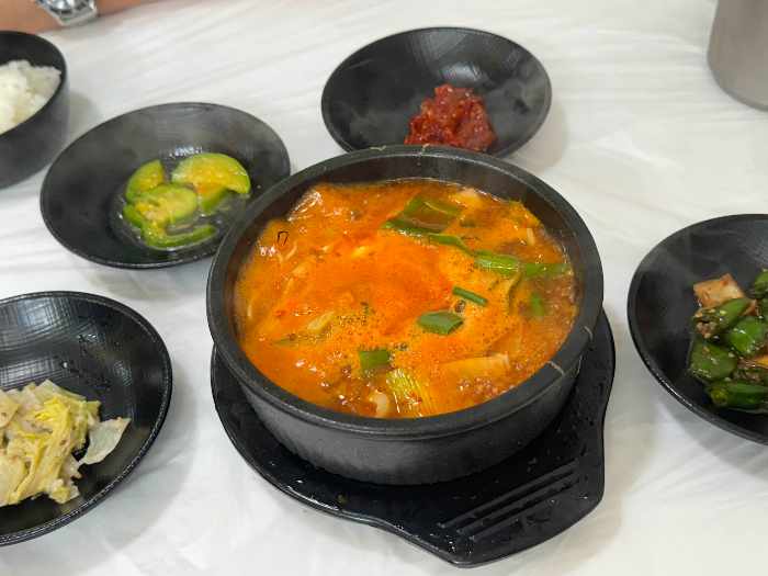 저는 꼭 먹어보고 싶었던 오징어해장국 주문했어요 . 밑반찬도 완전 정갈 그 자체로 세팅되고 간도 다 적절히 잘 맞았어요. 오징어해장국은 늘 해장을 달고 사는터라 이것저것 해장국 다 먹어본 저에게도 조금은 색다른 맛이였어요. 빨간 국물에 맞게 얼큰하니 시원한 국물은 한입만 먹어도 속이 쏵 풀리는 기분!