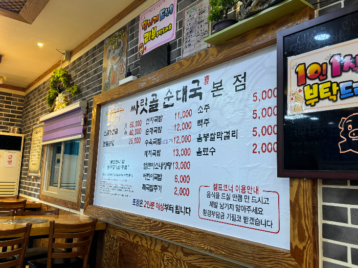 아산 순대국 맛집 싸릿골순대국 메뉴판입니다. 순대국 외에도 돼지국밥 , 내장탕 등 판매하고 있고 술 안주로 넘 좋아보이는 소곱창 전골도 궁금해집니다.