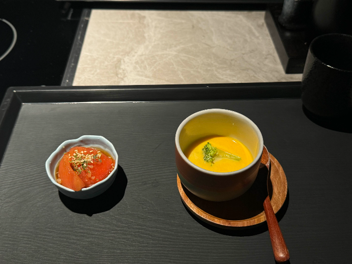 가장 먼저나온 단호박소스 계란찜과 토마토 샐러드 , 계란찜이 너무 폭신하고 맛있어서 한 입 먹자마자 순삭해렸어요. 고소하고 담백하니 식감까지 완벽.