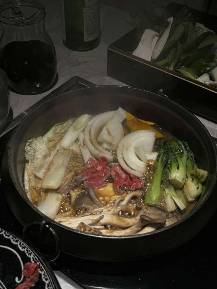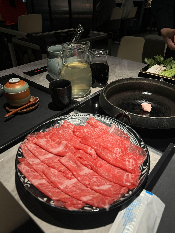 얇은 스키야키 고기와 재료들이 같이 나왔습니다. 빛깔부터 고기 퀄리티가 넘 좋아보이죠 ? 한우 무한리필이라 고기를 계속 무제한으로 먹을 수 있는데 제가 추가로 주문해 본 결과 앞서 나온 고기와 똑같이 질 좋은 고기가 계속 나오더라구요. 기본적으로 양 자체도 많아서 여러번 리필은 필요하지 않을 정도였어요.