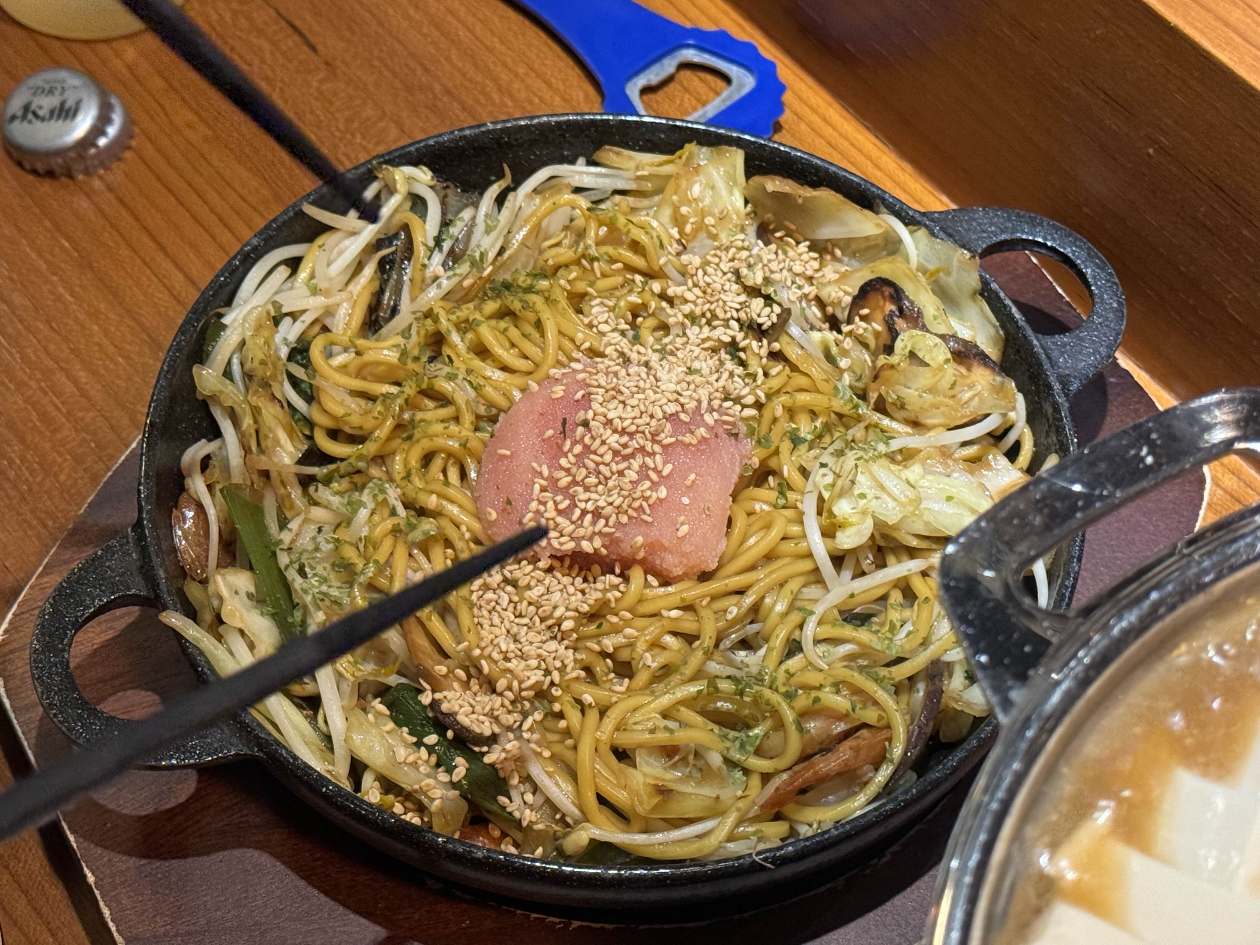 배고파서 배 채울 용으로 주문했던 명란야끼소바, 양 굉장히 푸짐하고 새우 등 해산물과 메인에 떡 얹어진 명란. 야끼소바는 대체로 짭짤하고 간이 센 편인데 간도 적절해서 좋았고 느끼하지 않아서 모츠나베와도 궁합이 꽤 좋은 편 이었습니다.