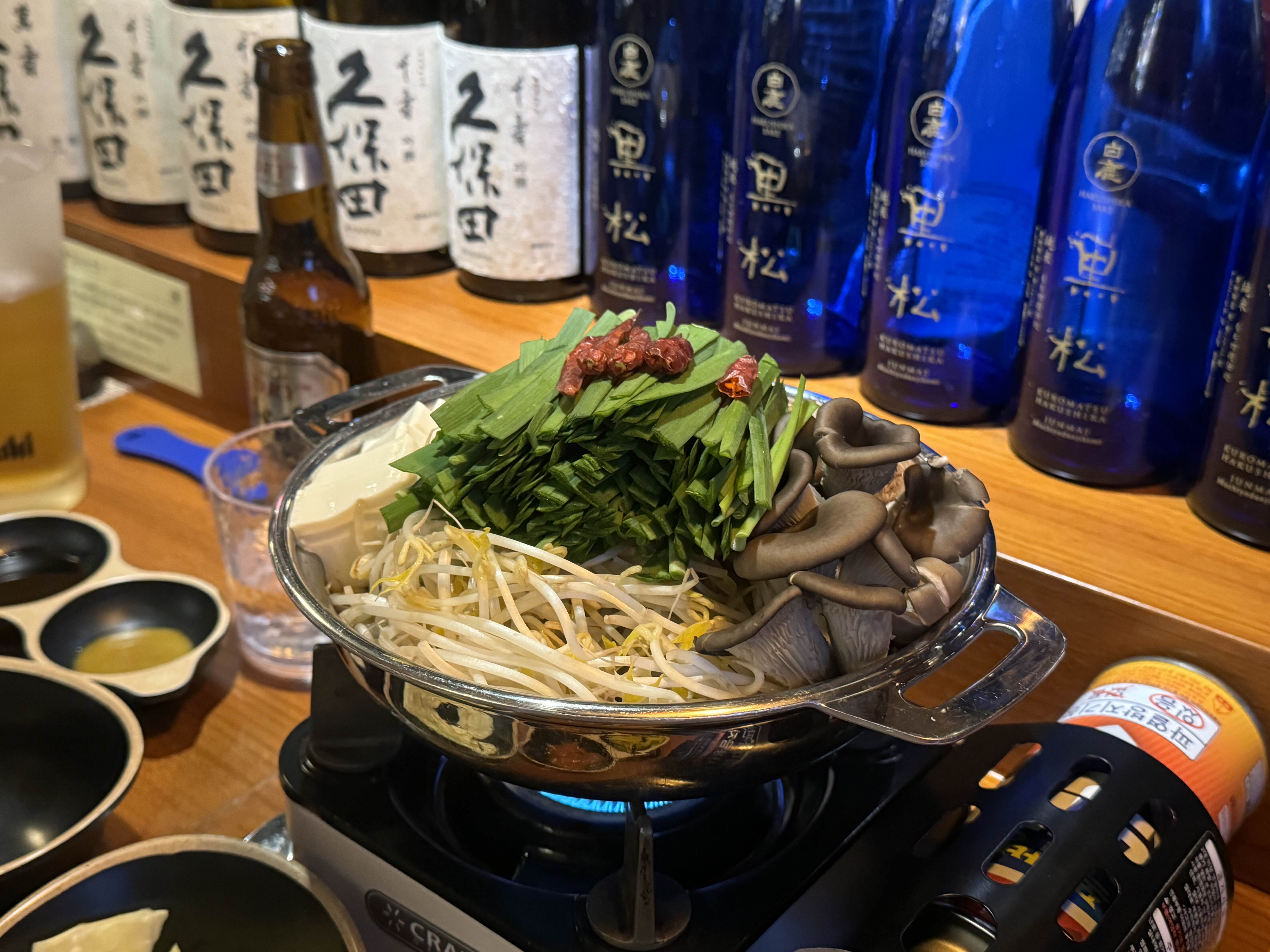 모츠나베 국물은 된장, 간장 맛 선택가능. 저희는 혼합 맛으로 선택했는데 두 가지 국물 베이스 맛을 다 경험할 수 있어서 개인적으로 혼합 추천입니다. 모츠나베 대창도 통통하고 각종 야채와 연두부 조합이 넘 좋아요, 뜨끈한 국물이 겨울철 술 안주로 모츠나베 너무 좋습니다.