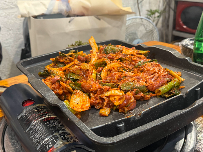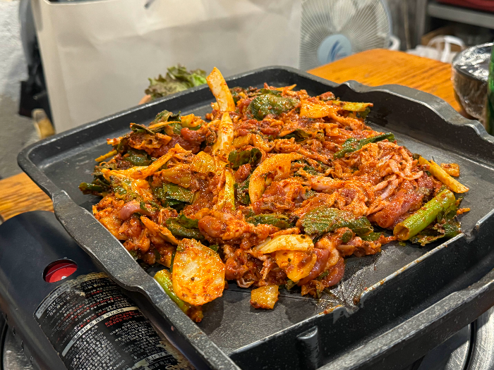 구이만으로는 조금 아쉬워서 오리 양념주물럭도 주문 , 의외로 이게 찐 맛있었어요. 양념이 시중에 많이 판매하는 흔한 양념 맛이 아닌 진하고 맛있는 양념이라 먹는 순간 계속 손이 가는 맛입니다. 사진만 보면 엄청 매워보이는데 저처럼 매운음식에 약한 사람도 충분히 맛있게 먹을 수 있는 적당한 매운맛, 거기에 각종 야채도 같이 볶아져서 훨씬 맛있었습니다. 여기다 볶음밥 해먹어도 양념이 기본적으로 잘 되어 있어서 너무 맛있어요.