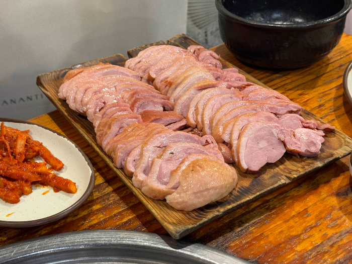 오리구이 등장 ,윤기좔좔 넘 맛있어보이죠? 확실히 고기 질이 좋아보입니다. 냄새도 없고 초벌해서 나오기 때문에 불판에 얼른 올려서 굽굽해서 먹어주면 된답니다. 갠적으로 깔끔하니 너무 맛있었어요. 식감도 쫄깃하고 두께도 적당해서 주문한 고기가 금방 동나더라구요. 저희는 얼른 먹고 추가주문해먹었답니다.