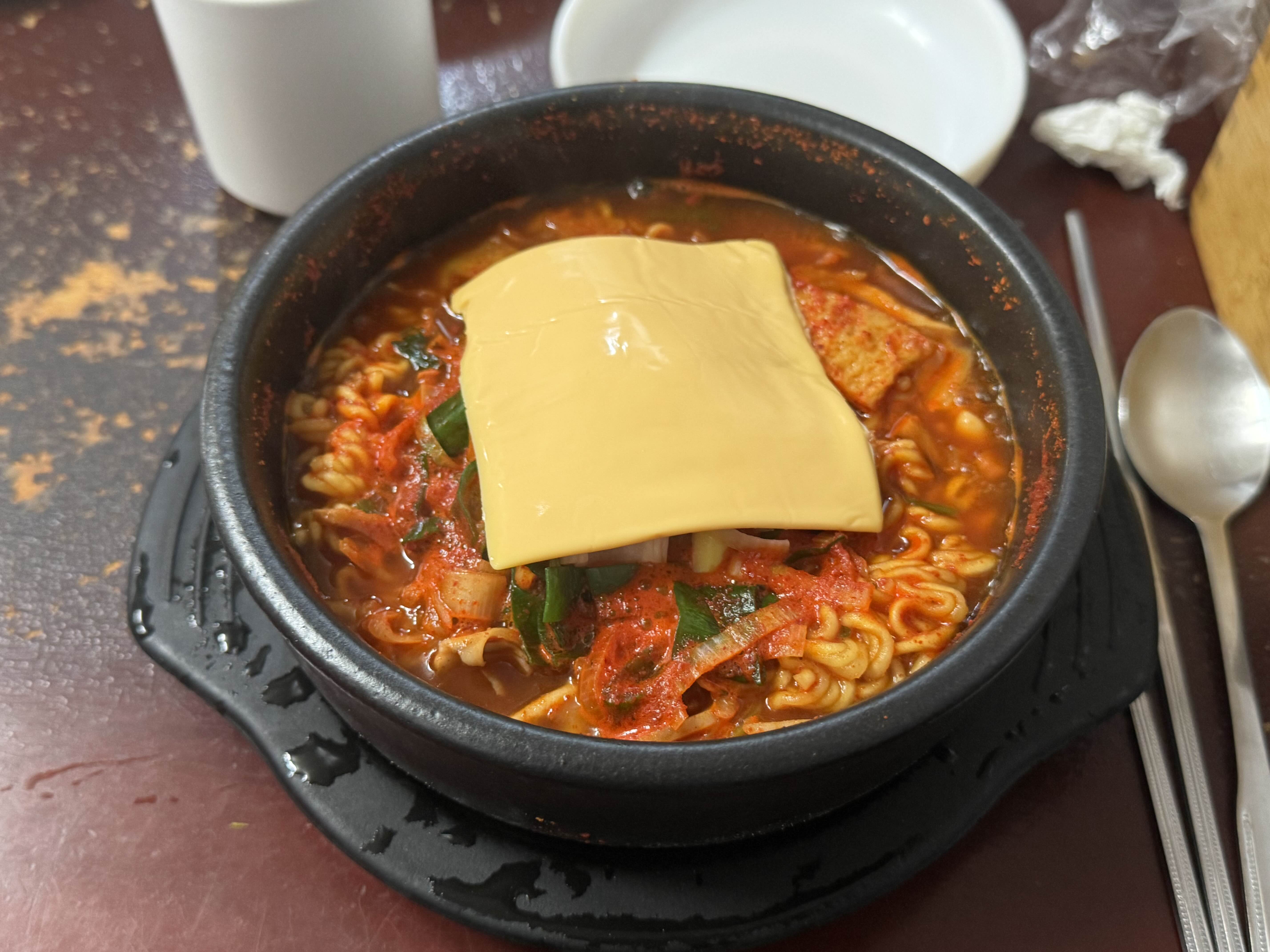 치즈 한 장 딱 올려주면 매운맛도 훨씬 중화되고 갠적으로 더 맛있더라구요. 밥도 셀프로 가져다먹을 수 있으니 꼬옥 밥과 같이 드시길! 아주 아주 맵지만 계속 생각날만큼 맛있는 경춘자 라땡 짬뽕라면, 저는 매운 맛이 그리울 때 또 재방문 할 예정입니다.