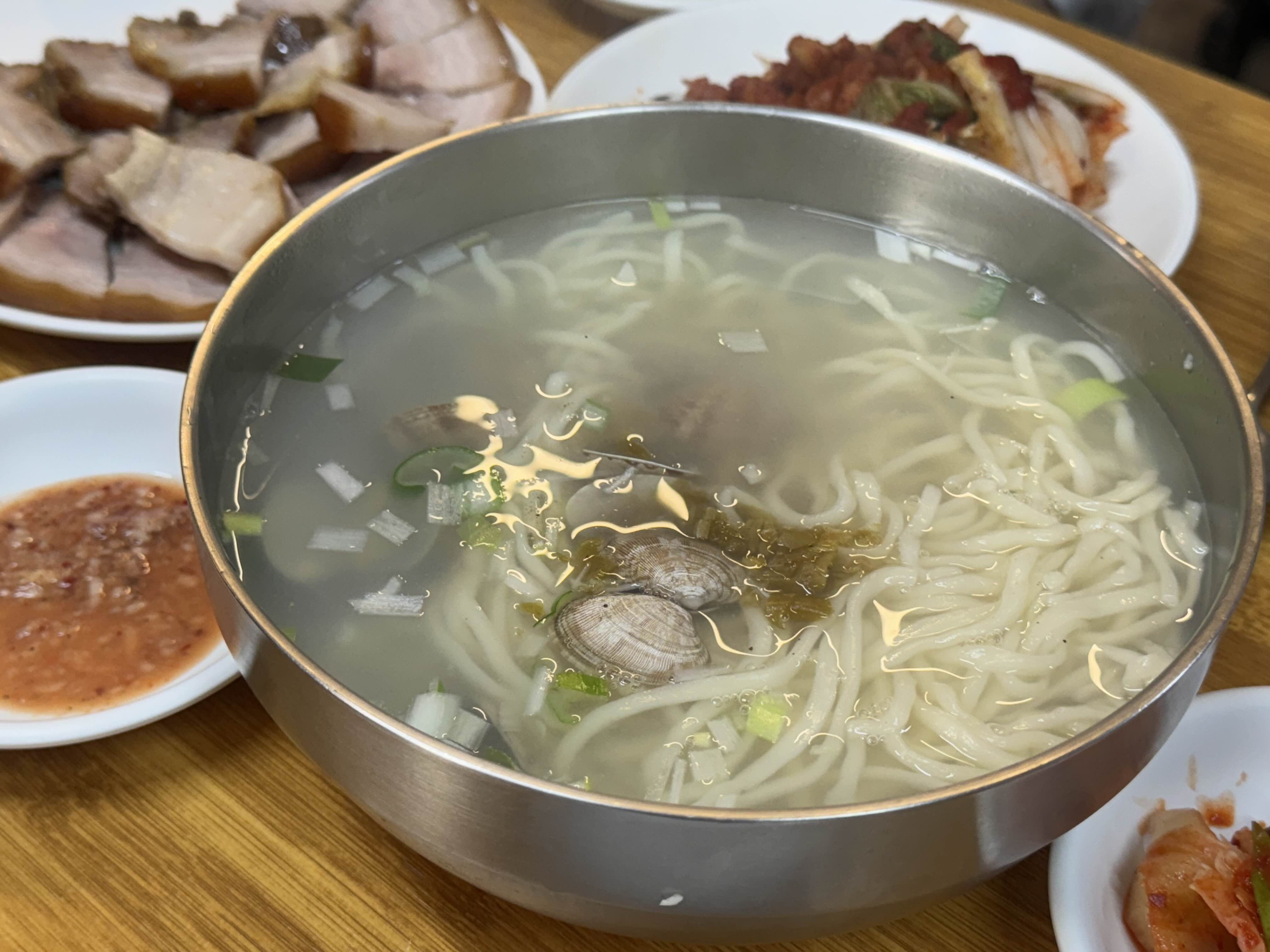 조개칼국수도 주문했는데 보쌈과 조화가 너무 잘맞는 맑은 국물이었어요. 특히나 1인분 양인데 면도 정말 많고 무엇보다 맛있습니다. 호로록 금방 먹게 되서 술 안주가 아닌 밥으로 먹었어도 좋았겠더라구요