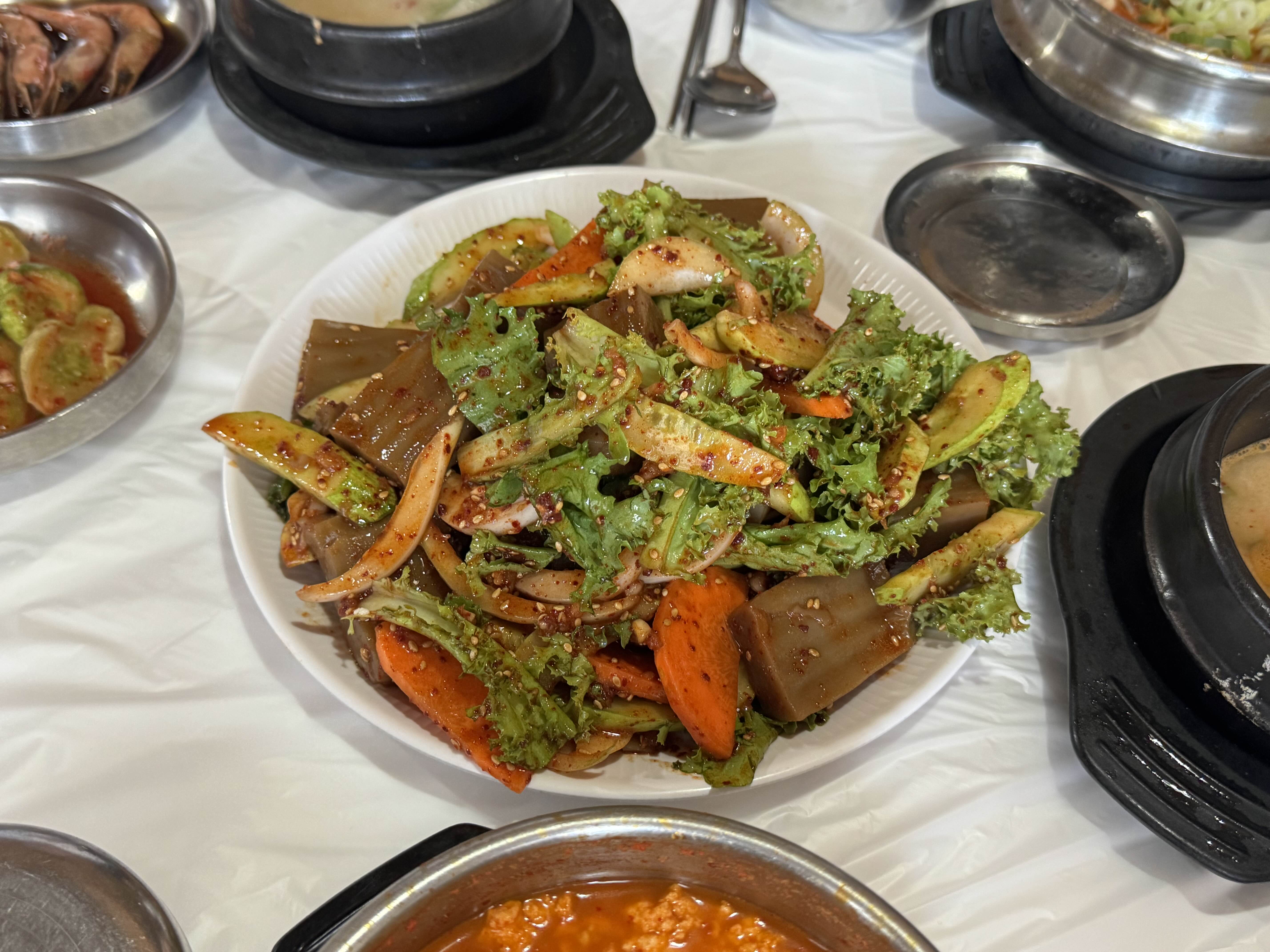 각자 순두부 하나씩 주문하고 사이드로 주문한 도토리묵, 부드러우면서도 탄탄한 묵은 인공적인 느낌이 전혀 없었고 퀄리티도 좋은데다 양까지 많아서 여럿이 나눠먹기 딱 좋았어요. 신선한 채소고명 거기다 고소한 들기름 조화 , 아른 아이 할 것 없이 다 좋아할 맛이라 가족단위 방문객들에게도 추천하는 메뉴랍니다.