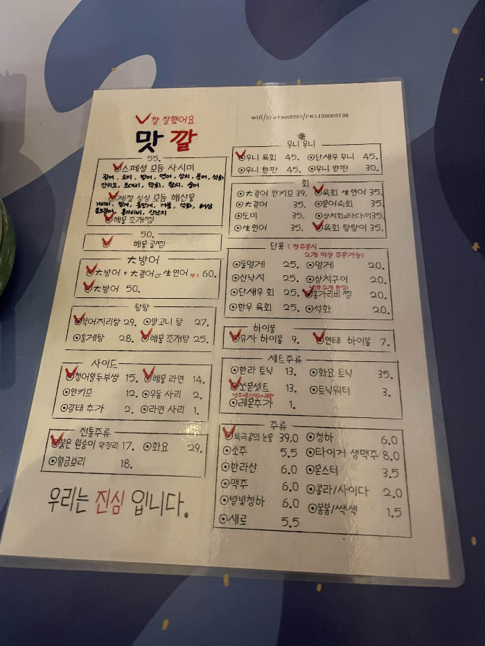 연남동 해산물맛집 맛깔 메뉴판입니다. 회 종류 그리고 해산물종류가 다양하게 준비되어 있습니다 고민이 되었던게 모듬 사시미를 먹을지 모듬 해산물을 먹을지 결정을 못했는데 요 근래 회는 많이 먹어서 아래처럼 주문해보았어요