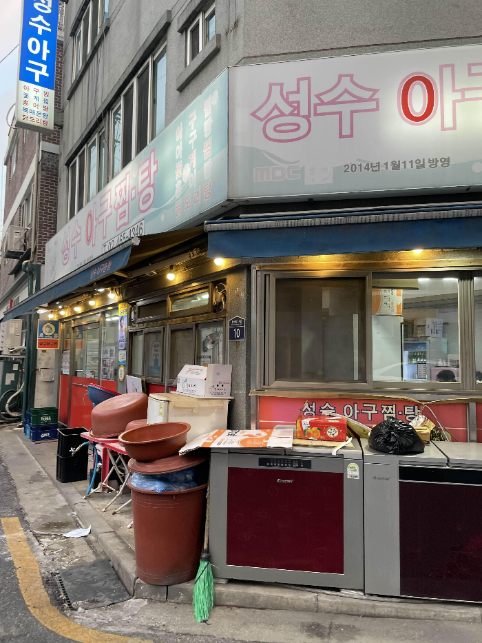 성수역보다는 뚝섬역과 서울숲역 근처에 위치한 성수아구찜, 외관부터 뭔가 오랜세월이 느껴지고 제가 좋아하는 노포같은 느낌이라 아주 마음에 들었답니다. 이 곳은 맛집일 수 밖에 없다 싶은 비쥬얼 ! 동네분들 사이에선 이미 유명한 맛집인지 내부도 꽉 차 있었어요. 겨우 한 자리 있어서 앉았답니다