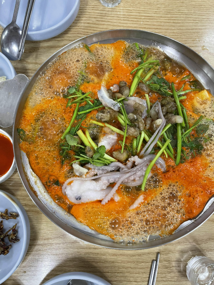 대충 익혀서 나오기 떄문에 낙지만 익을정도로 팔팔 끓여먹으면 된답니다. 국물 한 입 맛보자마자 크.. 너무 맛있어서 놀랐어요. 자극적일 줄 알았는데 생각보다 간이 쎄지 않아서 계속 끓여도 괜찮을정도? 그리고 무엇보다 국물이 너무 시원했어요. 먹으면서 해장되는 느낌이에요
