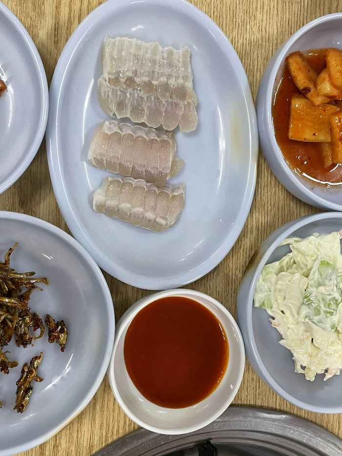 주문을 하고나니 기본 밑반찬을 내어주시는데 독특한게 홍어를 주시더라구요? 못드시는 분들도 많기 때문에 먹을줄 아는지 물어보고 주셨어요. 많이 삭힌 건 아니라 먹을만 했어요 ㅎㅎ