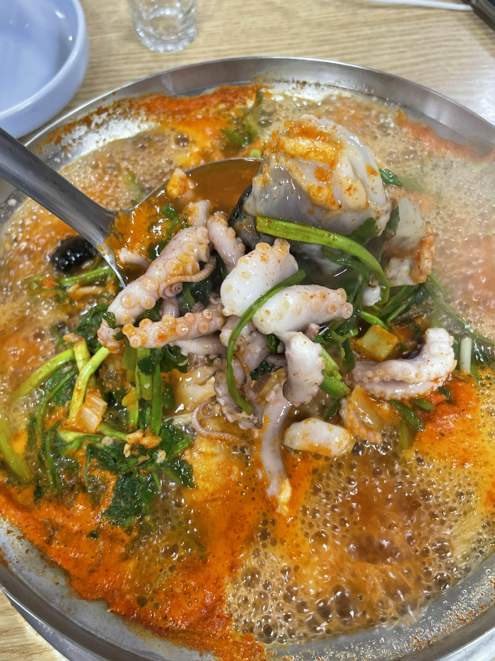 너무나도 맛있어보이는 비쥬얼의 낙지아구탕 등장, 와 요건 진짜 보자마자 소주안주로 딱이다 싶었어요. 큼지막한 낙지가 통으로 올라가있고 아구도 살 가득한걸로 많이 들어있어서 일단 퀄리티 너무 좋다 싶었답니다.