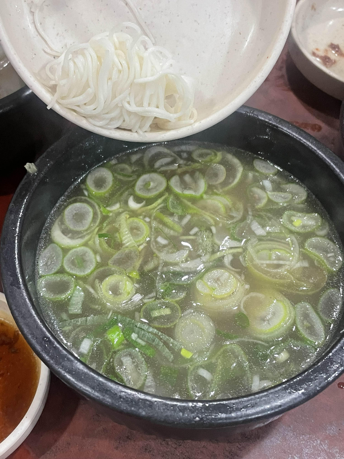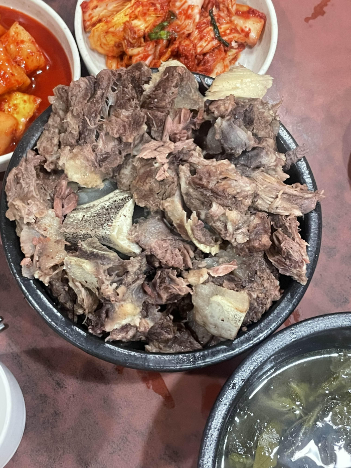 이왕 온거 뼈다귀찜만 먹긴 아쉬우니 곰탕과 꼬리곰탕도 맛보려고 주문했어요. 요건 곰탕인데 소면을 넣어먹을 수 있어서 점심에 와서 식사로 먹기에도 딱이였어요. 특히나 맑은 국물인데 진해서 해장용으로도 최고에요. 뼈다귀찜이랑도 잘 어울리니 국물 필요하면 같이 주문하시는 거 괜찮아요