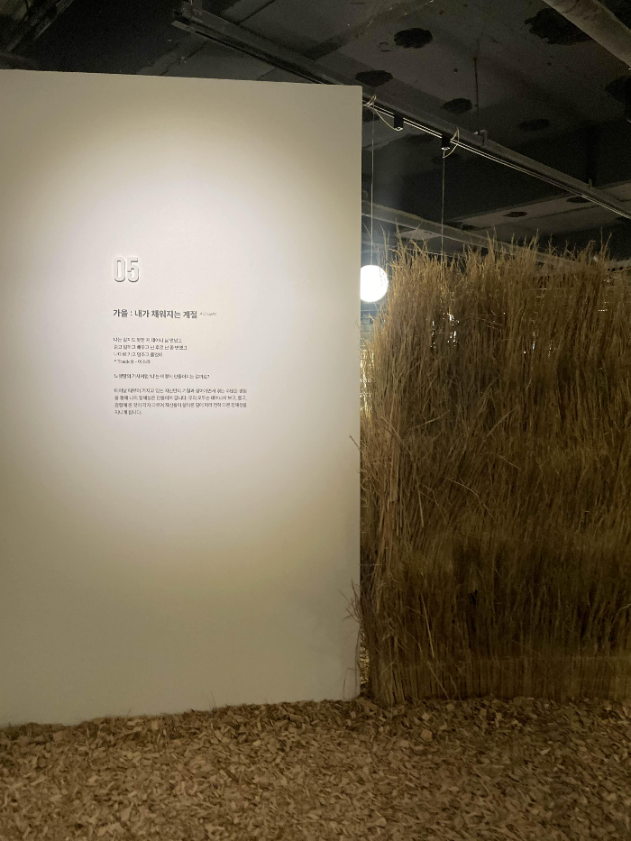 다음은 가을 : 내가 채워지는 계절이라는 테마에요. 가을의 갈대밭을 재연해두었고 바닥엔 낙엽이 잔뜩 깔려 가을 분위기를 완벽히 구현해두었는데요 , 갠적으로 가장 맘에 들었던 공간이에요. 사진이 잘 나오기도 했고 낙엽을 통해 다양한 나의 정체성을 확립한다는 의미의 문구도 인상깊었거든요.