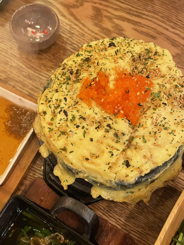 사이드메뉴는 볶음밥, 차돌라면, 멘보샤 등 아주 다양한 메뉴가 있는데 저희는 핵폭탄 계란찜을 선택했어요. 나오자마자 감탄할 만한 비쥬얼에 너무 잘 선택했다 싶었답니다. 날치알도 듬뿍 올라가있고 포실포실한 식감이 넘 맛있었던 계란찜이에요