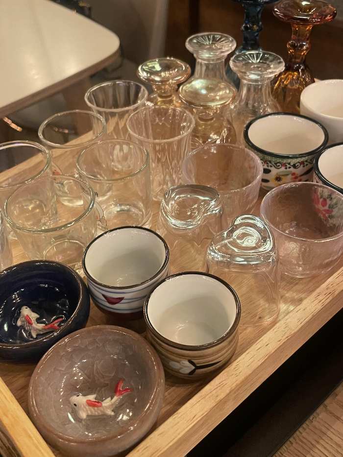 그리고 넘 재밌었던 부분 ,소주를 주문했더니 잔을 선택하라고 요렇게 내어주시는데요. 이런 것도 사소하지만 넘 귀여운 이벤트죠? 저는 바닥에 물고기가 있는 잔 선택했어요.