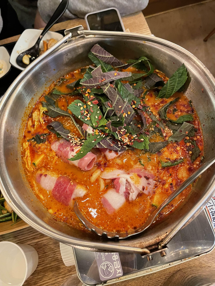 맛나게 곱창을 클리어하면 세트메뉴에 포함된 곱창전골이 등장합니다. 단품으로 시켜도 좋지만 요렇게 세트로 시키는게 훨씬 좋을 듯 해요. 육수가 사골육수라 일단 국물이 엄청 찐했고 곱창도 들어있지만 차돌과 순두부가 들어있어서 훨씬 맛있었답니다. 국물은 칼칼한 편이였고 소주안주로 아주 딱이였어요
