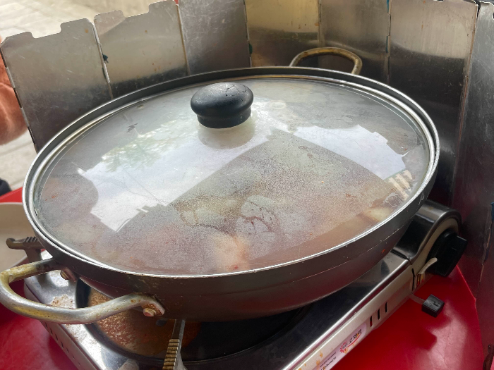 10-15분 가량 기다리니 자리가 났는데 바깥에 위치한 야외테이블이였어요. 완전 사람들이 지나다니는 쪽은 아니라서 얼른 앉아서 김치찌개 4인분과 오뎅사리, 칼국수 사리 주문을 했답니다. 주문과 등시에 빠르게 세팅이 되는 간판없는 김치찌개집의 김치찌개 , 바깥이라 그런지 불이 꺼지지 않게 가림막도 놔주셨답니다. 안쪽에는 2층 까지 자리가 있기 때문에 가게 규모에 비해 테이블 갯수가 꽤 많은 편이에요 , 너무 오래 기다릴 일은 없으니 꼭 와서 드셔보심 좋을 듯 합니다