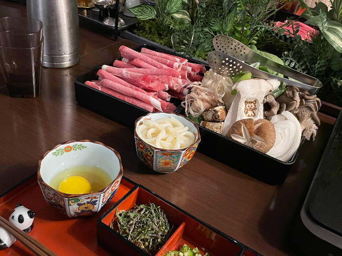 저녁 호주산/목심 20,000원 2인분 주문했습니다. 바로바로 야채와 고기가 세팅되는데 너무 깔끔하게 나와서 만족스러웠습니다. 얇게 썰린소고기와 수북한 야채와 버섯들, 그리고 스키야키 먹을때 꼭 필요한 날계란과 같이 곁들여 먹을 청양고추와 깻잎 등 나오는 것들이 다 깔끔했습니다. 특히 날계란에는 이미 간이 되어 있어서 스키야키 찍어먹을 때 너무 맛있더라구요