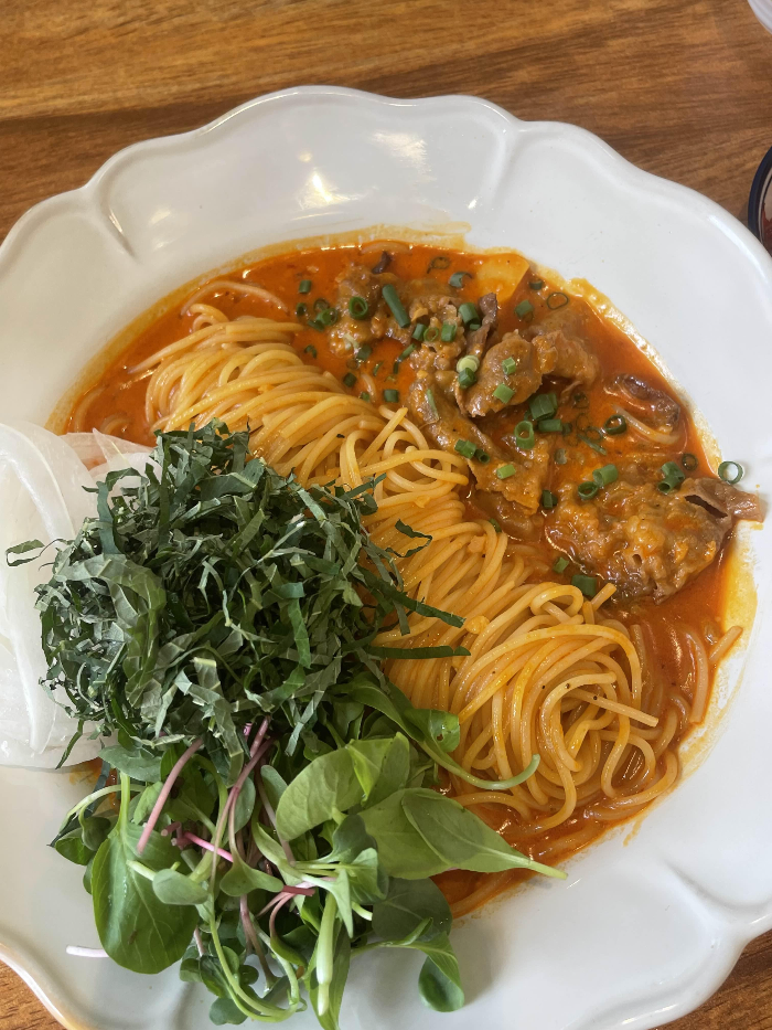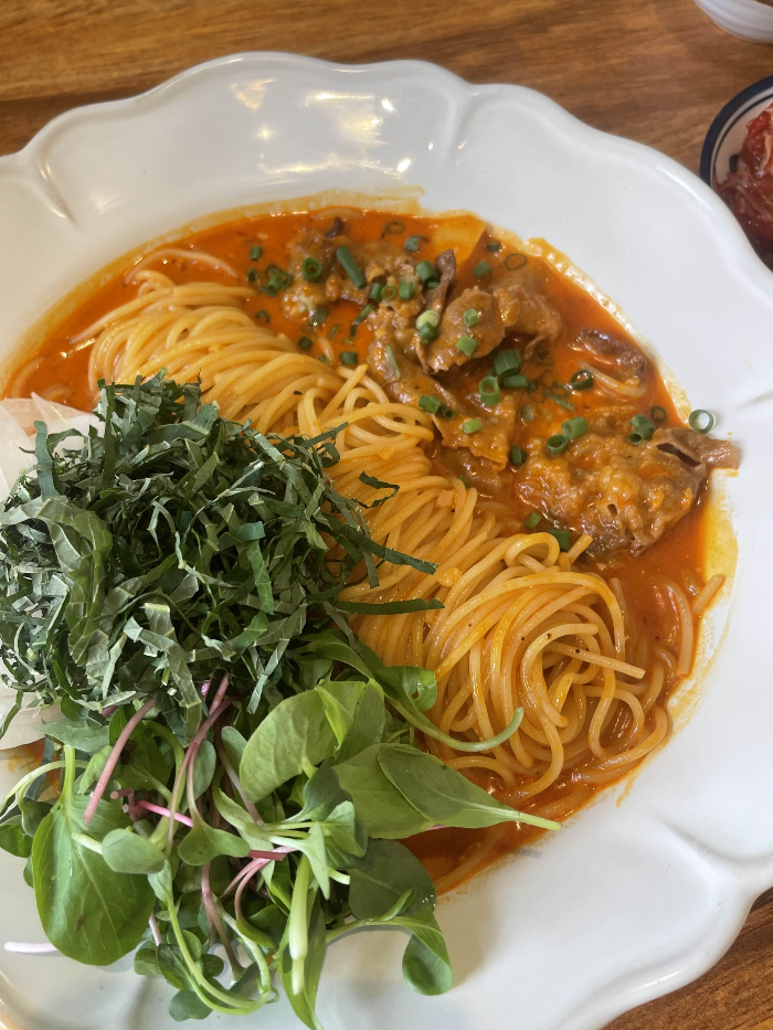 주문은 자리에서 패드를 이용했습니다. 차돌중화크림파스타와 안심카츠정식 주문했답니다. 먼저 나온 차돌중화크림파스타는 매콤한 크림소스를 쎈불에 차돌과 함께 볶아낸 중식파스타인데요, 매콤하니 맛있는 파스타소스에 차돌박이, 깻잎 , 양파가 토핑으로 올라가 있는데 조화가 넘 잘 맞고 맛있었답니다. 파스타는 느끼할 수도 있는데 중식 베이스의 양념이라 전혀 물리지도 않아서 누구나 호불호 없이 좋아할 수 있는 파스타였어요. 갠적으로 완전 극호, 해장용으로 좋을 만큼 속이 풀리는 맛이더라구요
