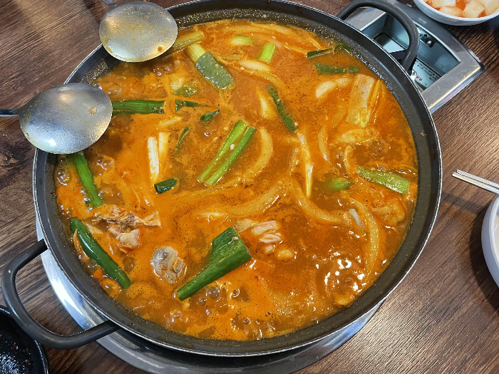 닭은 약간 작은 닭을 쓰는데 저는 오히려 이게 매력이더라구요 . 사리는 수제비 사리, 감자사리, 우동사리 필수입니다 . 대부분 익혀서 나오기 때문에 끓어나면 바로 먹으면 됩니다. 계속 끓이면서 먹으면 되는데 중간에 좀 짜진다 싶으면 육수를 요청할 수도 있어서 기호에 맞게 먹을 수 있답니다. 갠적으로 이 근방 닭 요리중에서는 제일 맛있는 것 같아요.