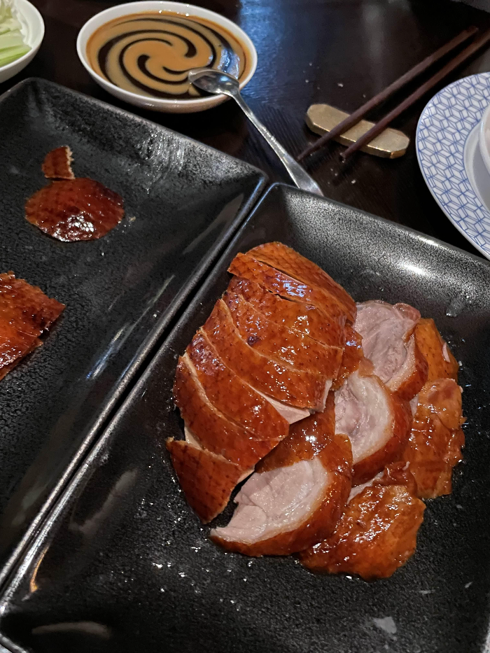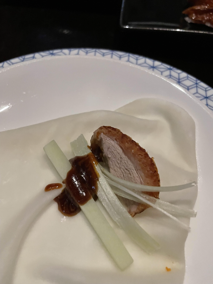 처음엔 껍질을 먼저 올려주셨는데 바삭하고 고소하니 넘 맛있었어요. 그리곤 살코기를 이렇게 먹기좋은 크기로 카빙해서 올려주십니다. 두 접시가 나왔는데 제가 한 접시만 찍어왔네요. 적당한 기름기와 부드러운 식감이 어우러져 넘 맛있게 먹었어요. 그리고 북경오리는 같이 곁들여 먹을 수 있게 소스와 오이 그리고 파 등을 같이 주시는데 자칫 물릴 수 있는 북경오리를 야채와 같이 먹으니 훨씬 맛나더라구요